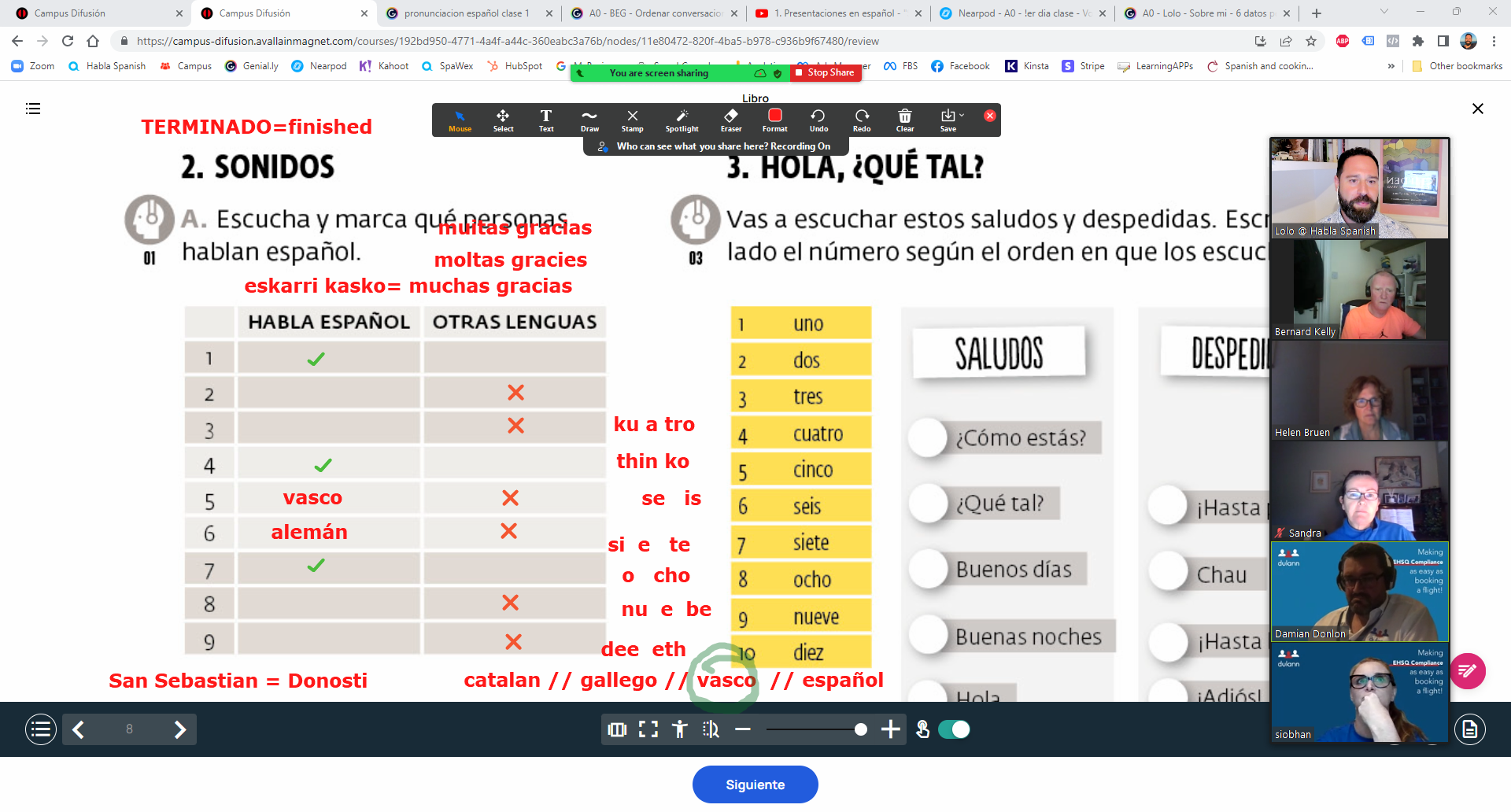 - ACT 2 – SONIDOS – Solución – from the listening exercise, when 9 people spoke in Spanish or other language plus the 3 conversations in Spanish